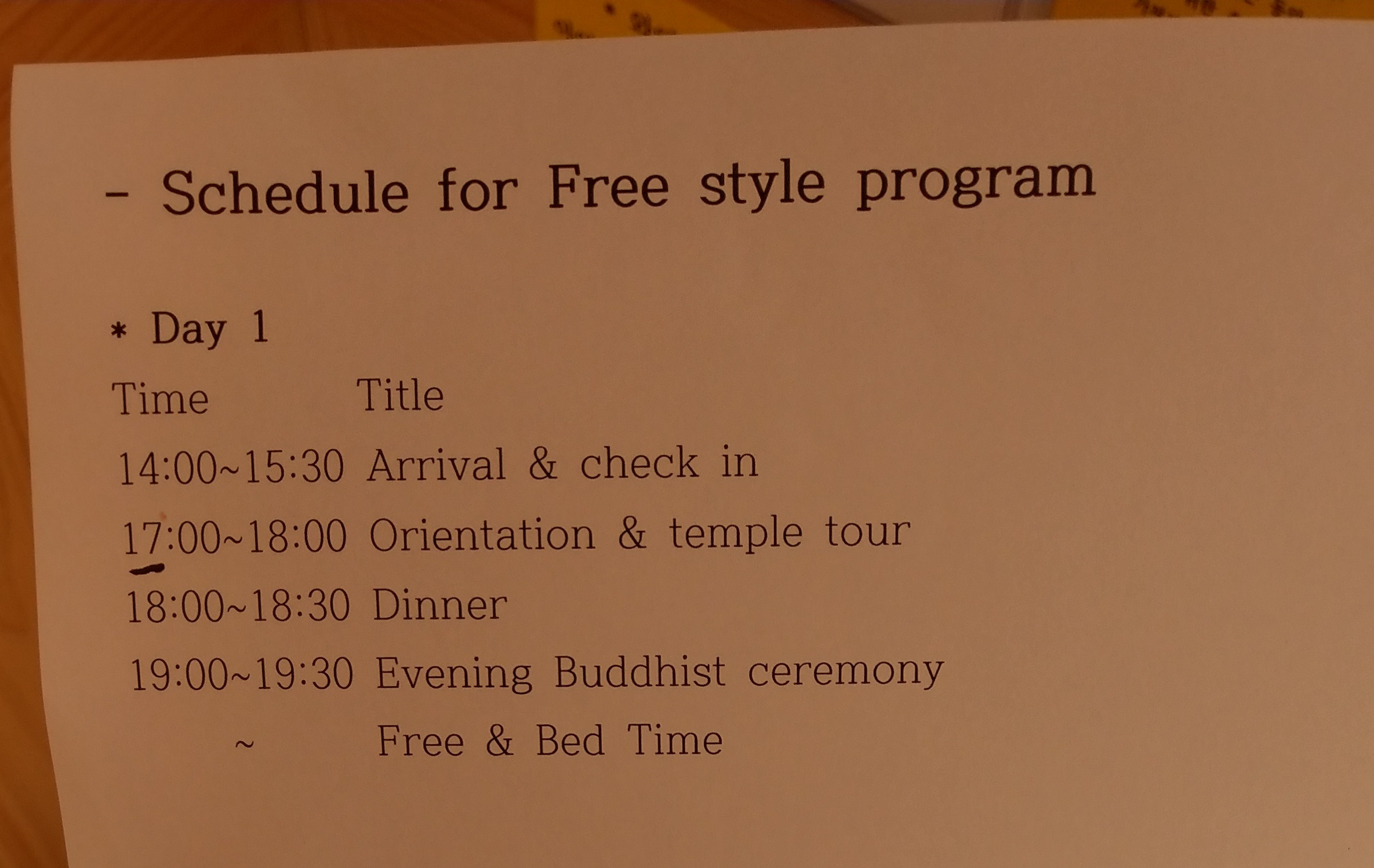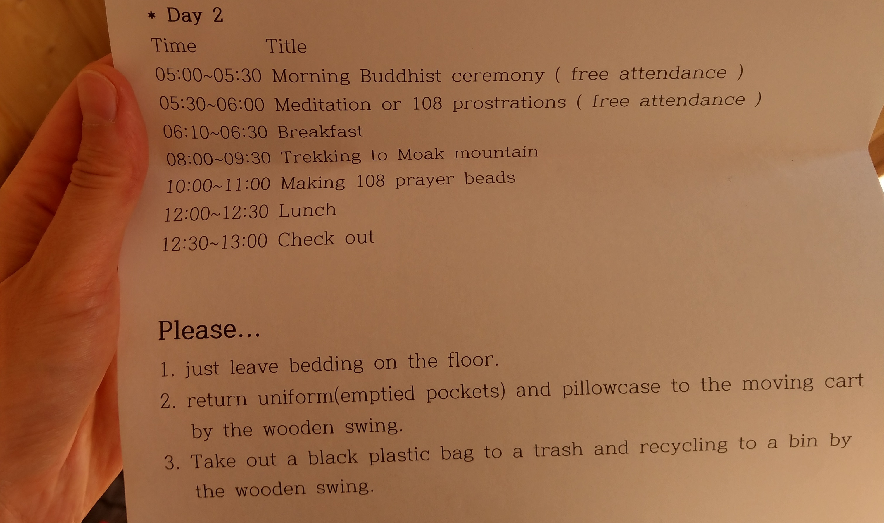 Длительность программ – от 1 дня. Самые популярные – на 3 дня / 2 ночи. Максимальный срок зависит от храма, но обычно длится 10 дней. 1 ночь в храме стоит около 50 000 вон (примерно 2800 рублей) и включает питание (вегетарианское) и специальную одежду.